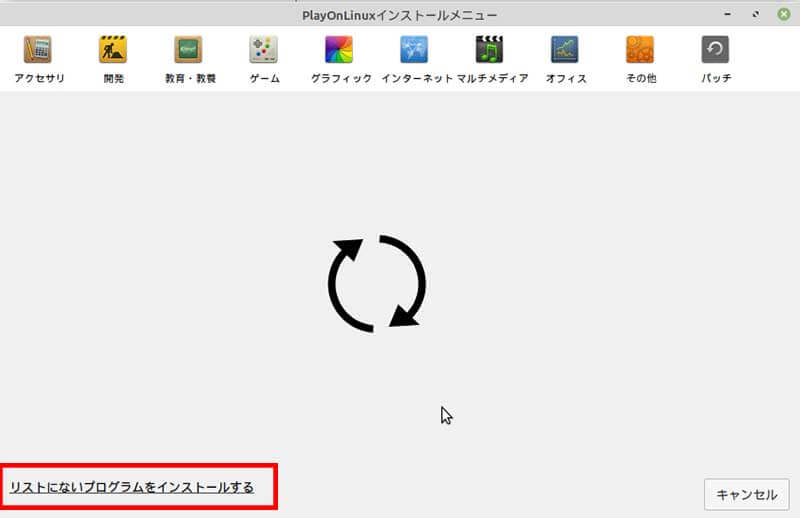 PlayOnLinuxのアプリケーションの一覧がいつまでも表示できない場合は、ターミナルから英語版を表示する上記のコマンドで起動すると取得できます。